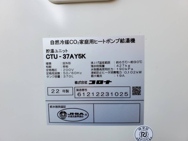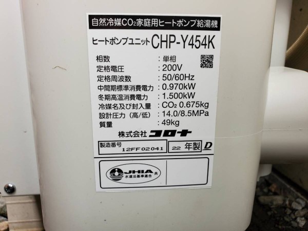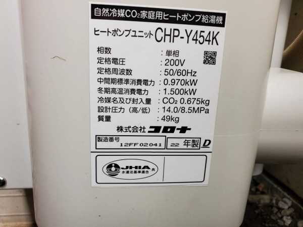 赤磐市惣分 コロナ自然冷媒CO2家庭用ヒートポンプ給湯機 貯湯ユニットCTU-37AY5K、ヒートポンプユニットCHP-Y454K エコキュート交換工事