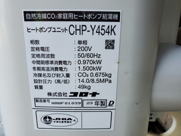 赤磐市惣分 コロナ自然冷媒CO2家庭用ヒートポンプ給湯機 ヒートポンプユニットCHP-Y454K エコキュート交換工事