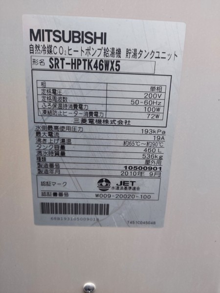 玉野市下山坂 三菱電機エコキュートSRT-HPTK46WX5→三菱電機家庭用自然冷媒CO2ヒートポンプ給湯機貯湯ユニットSRT-STK376D エコキュート交換工事