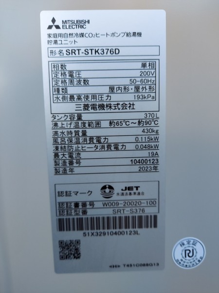 玉野市石島 三菱電機家庭用自然冷媒CO2ヒートポンプ給湯機貯湯ユニットSRT-STK376D エコキュート交換工事