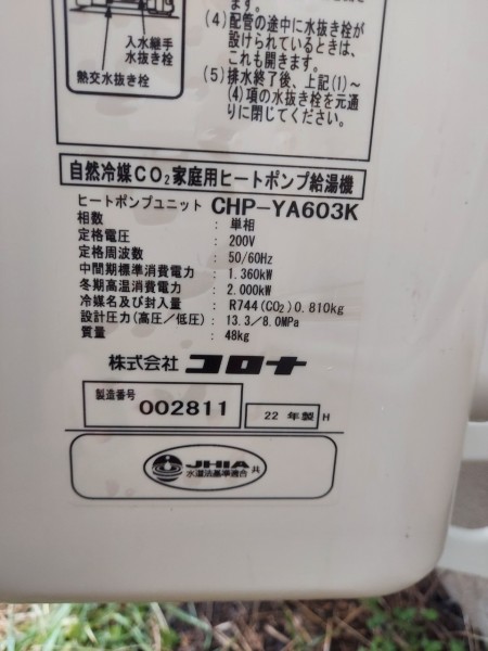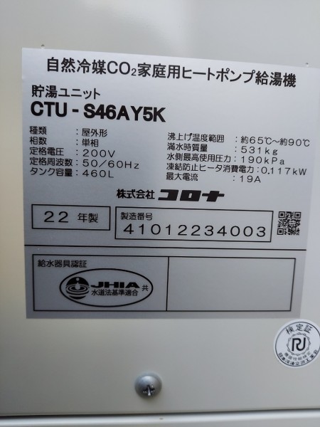 岡山市中区 コロナエコキュート→コロナ自然冷媒CO2家庭用ヒートポンプ給湯機貯湯ユニットCTU-S46AY5K エコキュート交換工事