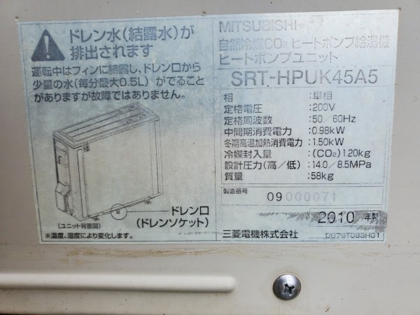 新見市菅生 三菱電機エコキュートSRT-HPUK45A5→コロナ自然冷媒CO2家庭用ヒートポンプ給湯機ヒートポンプユニットCHP-Y454K エコキュート交換工事