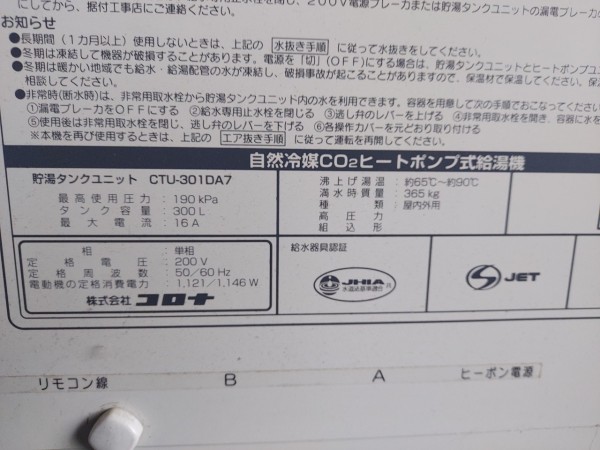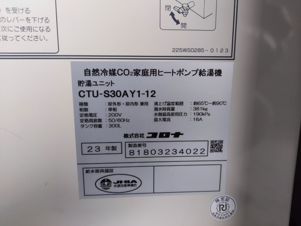 井原市下稲木町 コロナ自然冷媒CO2家庭用ヒートポンプ給湯機貯湯タンクユニットCTU-301DA7、貯湯ユニットCTU-S30AY1-12 エコキュート交換工事