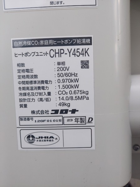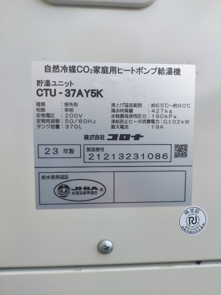 岡山市中区 コロナ自然冷媒CO2家庭用ヒートポンプ給湯機ヒートポンプユニットCHP-Y454K、貯湯ユニットCTU-37AY5K エコキュート交換工事