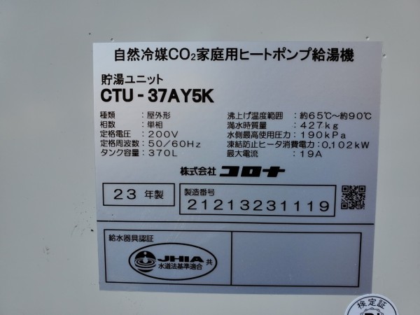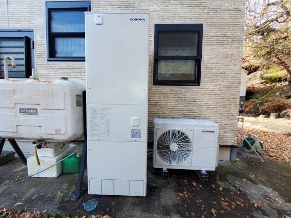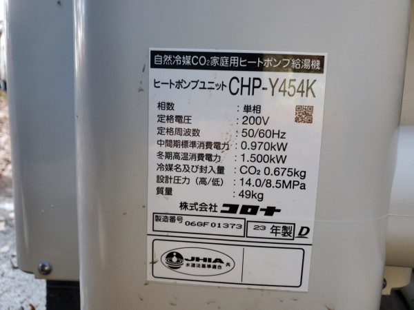 新見市菅生コロナ自然冷媒CO2家庭用ヒートポンプ給湯機ヒートポンプユニットCHP-Y454K、貯湯ユニットCTU-37AY5K エコキュート交換工事