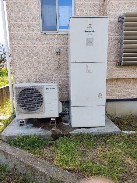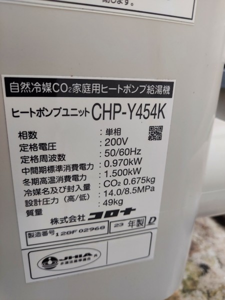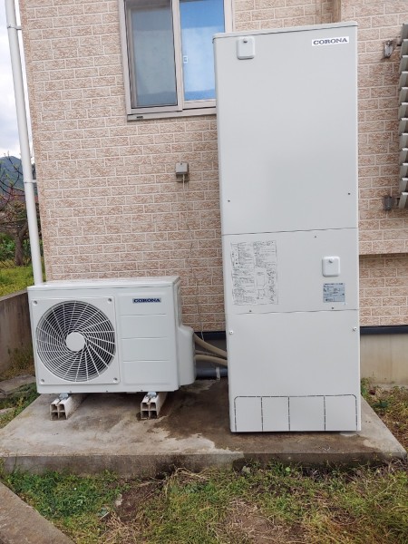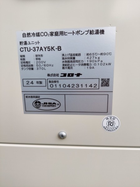 高梁市鍜冶町 パナソニックエコキュート→コロナ自然冷媒CO2家庭用ヒートポンプ給湯機貯湯ユニットCTU-37AY5K-B、ヒートポンプユニットCHP-Y454K エコキュート交換工事