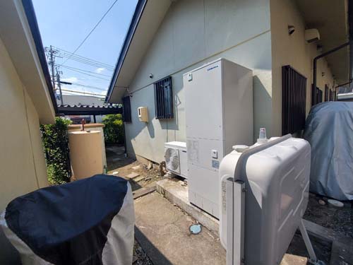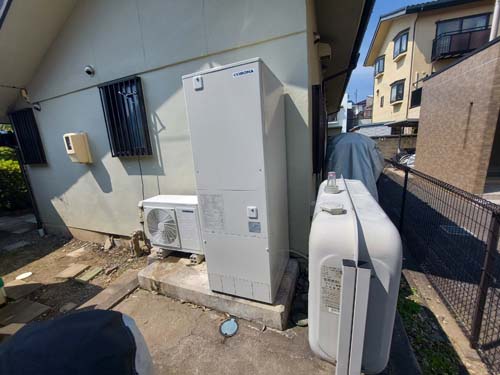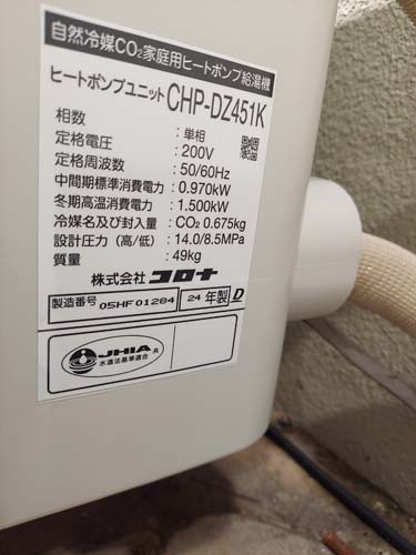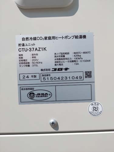 岡山市中区 コロナ自然冷媒CO2家庭用ヒートポンプ給湯機 貯湯ユニットCTU-37AZ1K、ヒートポンプユニットCHP-DZ451K エコキュート交換工事