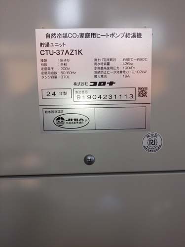 笠岡市甲弩 コロナ自然冷媒CO2家庭用ヒートポンプ給湯機貯湯ユニットCTU-37AZ1K、ヒートポンプユニットCHP-DZ451K エコキュート交換工事