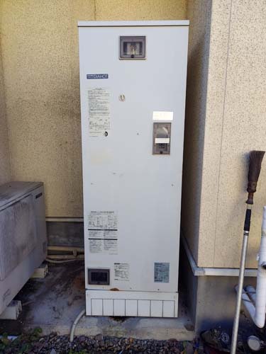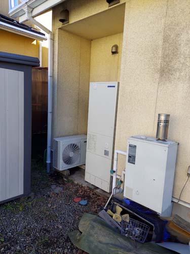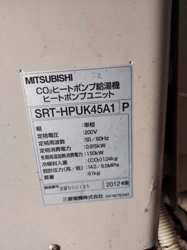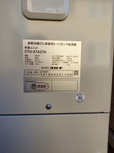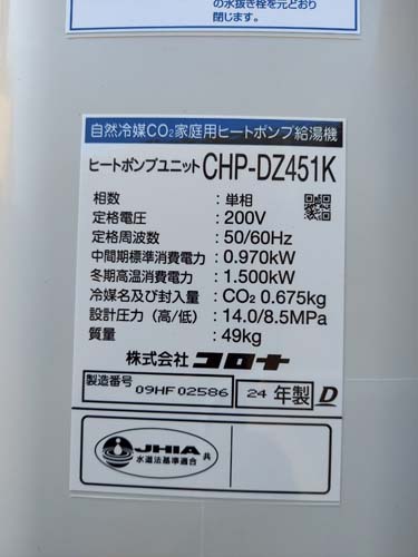 高梁市鍜冶町 三菱電機エコキュートSRT-HPUK45A1→コロナ自然冷媒CO2家庭用ヒートポンプ給湯機貯湯ユニットCTU-37AZ1K、ヒートポンプユニットCHP-DZ451K エコキュート交換工事