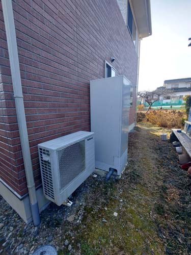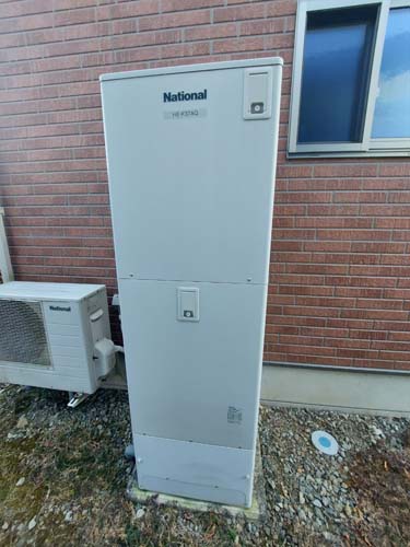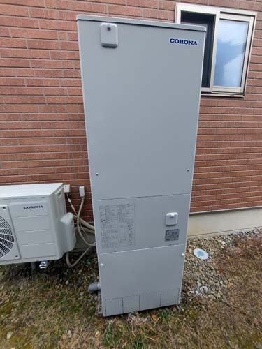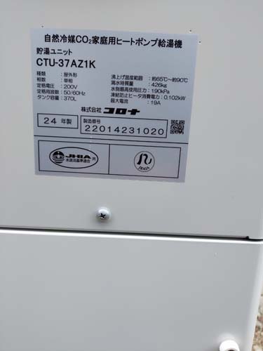 倉敷市倉敷ハイツ Nationalエコキュート→コロナ自然冷媒CO2家庭用ヒートポンプ給湯機貯湯ユニットCTU-37AZ1K、ヒートポンプユニットCHP-DZ451K エコキュート交換工事
