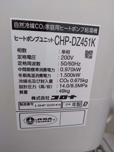 倉敷市倉敷ハイツ コロナ自然冷媒CO2家庭用ヒートポンプ給湯機貯湯ユニットCTU-37AZ1K、ヒートポンプユニットCHP-DZ451K エコキュート交換工事