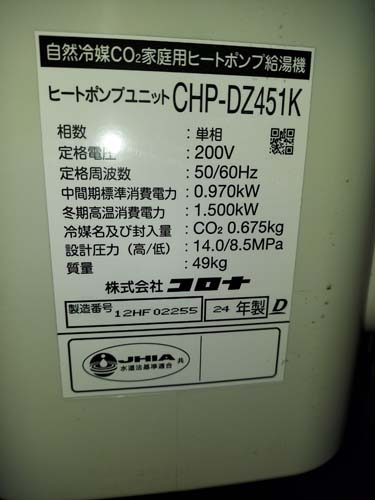 倉敷市大畠 コロナ自然冷媒CO2家庭用ヒートポンプ給湯機 ヒートポンプユニットCHP-DZ451K エコキュート交換工事