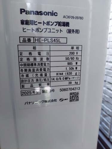 赤磐市坂辺 パナソニック家庭用ヒートポンプ給湯機 ヒートポンプユニットHE-PLS45L エコキュート交換工事|岡山県のエコキュート専門交換工事店|岡山エコキュート交換ショップ補助金対応可能