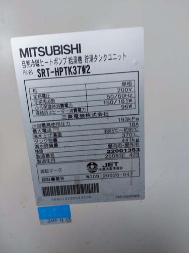 赤磐市可真下 三菱電機自然冷媒ヒートポンプ給湯機 貯湯タンクユニットSRT-HPTK37W2→コロナ自然冷媒CO2家庭用ヒートポンプ給湯機 ヒートポンプユニットCHP-DZ451K エコキュート交換工事