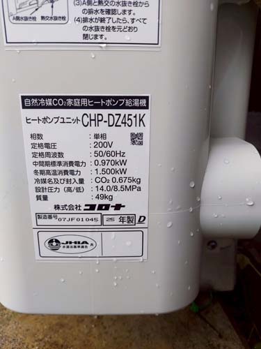 赤磐市可真下 コロナ自然冷媒CO2家庭用ヒートポンプ給湯機 ヒートポンプユニットCHP-DZ451K エコキュート交換工事|岡山県のエコキュート専門交換工事店|岡山エコキュート交換ショップ補助金対応可能